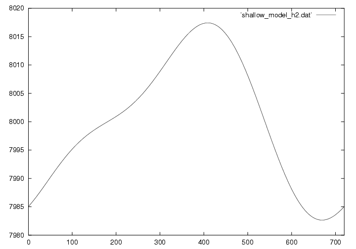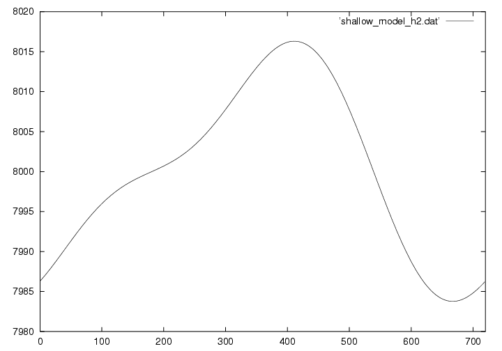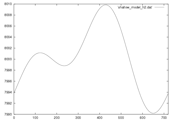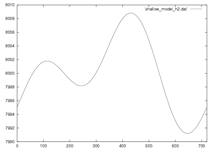 浅水方程式系とは、その名の通り浅い空間(水平スケールの方が鉛直スケールよりもずっと大きい)での流体の運動を記述する方程式です。 実際は3次元ですが、この演習では1次元で描いています。 下の図は8kmの大気に5mの変位と速度を与えておき、時刻がたつとともにどのように変化するかを示しています。 詳しい理論については ここ(準備中) から見てください。
