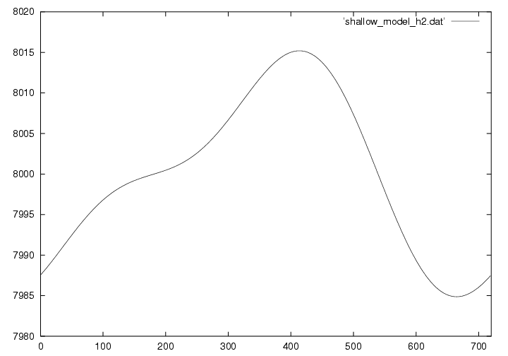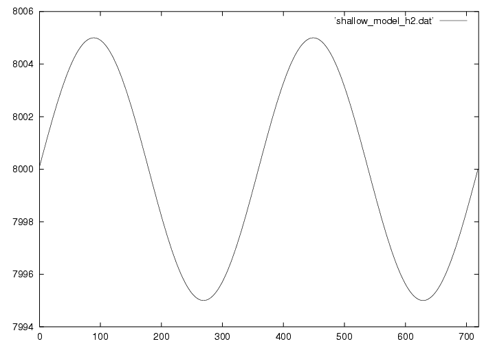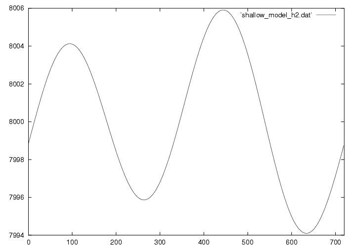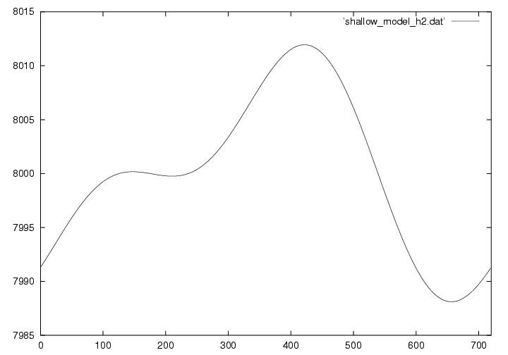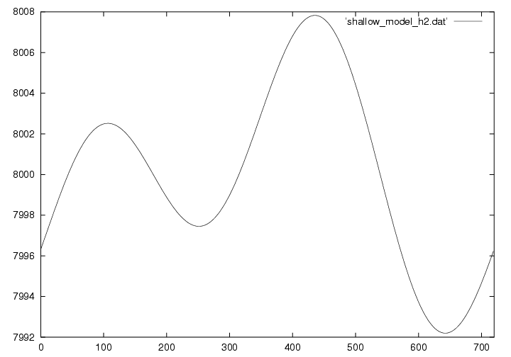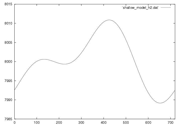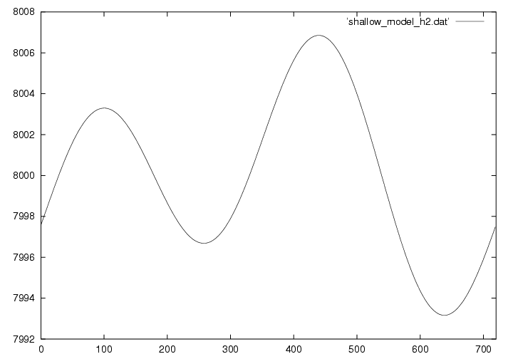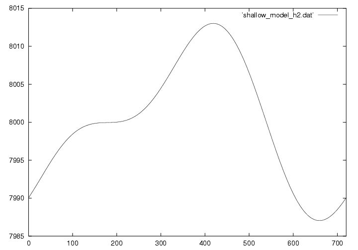 浅水方程式系とは、その名の通り浅い空間(水平スケールの方が鉛直スケールよりもずっと大きい)での流体の運動を記述する方程式です。 実際は3次元ですが、この演習では1次元で描いています。 下の図は8kmの大気に5mの変位と速度を与えておき、時刻がたつとともにどのように変化するかを示しています。 詳しい理論については ここ(準備中) から見てください。